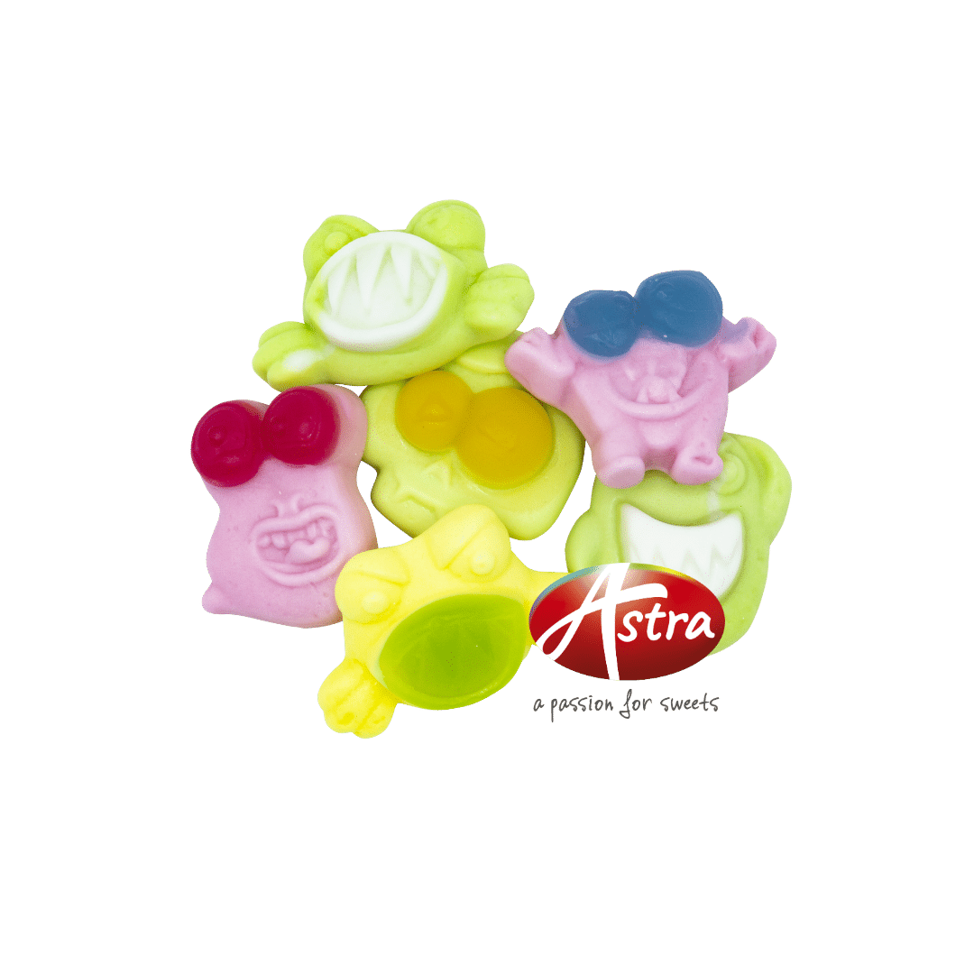 glukossirap, socker, vatten, gelatin, syror (E270, E296, E330), geleringsmedel (pektin), aromämnen, livsmedelsfärgämne (koncentrat av spirulina och safflor, koncentrat av spirulina och äpple), svart morotskoncentrat, färgämnen (E100, E160c), vegetabilisk olja (kokos), ytbehandlingsmedel (karnaubavax).