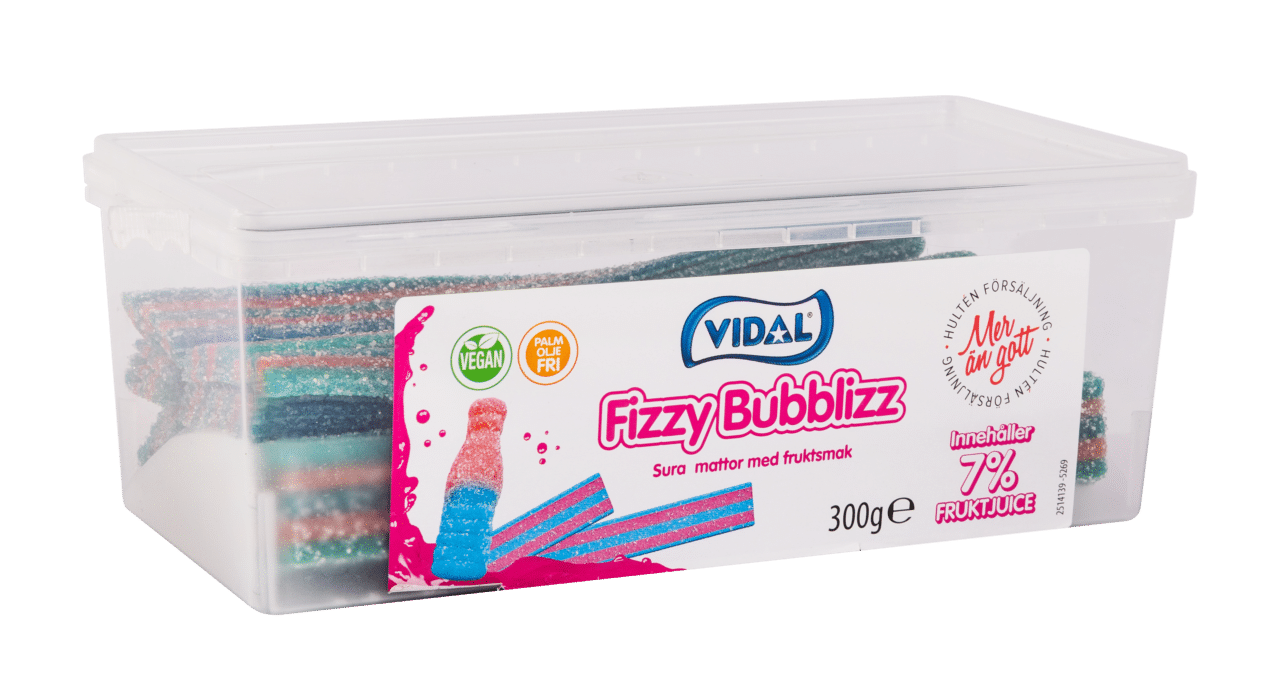 Socker, glukos-fruktossirap, vetemjöl (innehåller gluten), 7% äpplejuice från koncentrater; syror: äpplesyra, citronsyra; dextros, kokosnöt, vegetabiliskt fett, majsstärkelse, smakämnen; antioxidant: askobinsyra; surhetsregulerande: kaliumcitrater; frukt och grönsakskoncentrater: Svarta vinbär, morot, äpple, rädisa, pumpa, tomat; salt, färger: E133. Kan innehålla spår av mjölk.