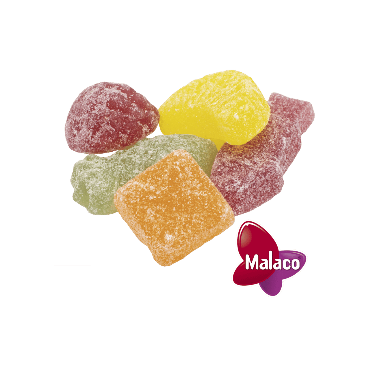 socker, glukossirap, stärkelse, glukos-fruktossirap, syror (citronsyra, vinsyra), aromer, koncentrat från (morot, svarta vänbär),