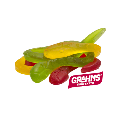 Ingredienser: socker, glukos/fruktossirap, vatten, gelatin, surhetsreglerande medel (äppelsyra), arom, färgämne (E100, E120, E133/E160a), ytbehandlingsmedel (veg.olja (kokos, raps), karnaubavax.