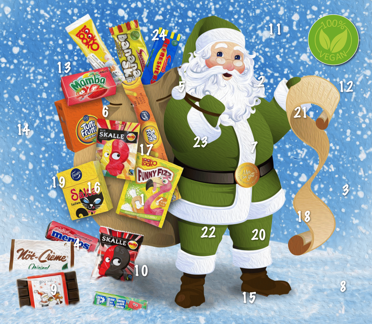 En superunik julkalender, vegan! Som enbart innehåller produkter från ledande producenter och som alla kan äta oavsett kosthållning. För en sak är helt klar, alla skall kunna ha en julkalender och kunna äta något riktigt gott som finns bakom varje lucka. Vår idé är att alla skall kunna vara delaktiga kring mystiken med att kunna öppna en ny god lucka varje dag utan konsumtionsbegränsningar.