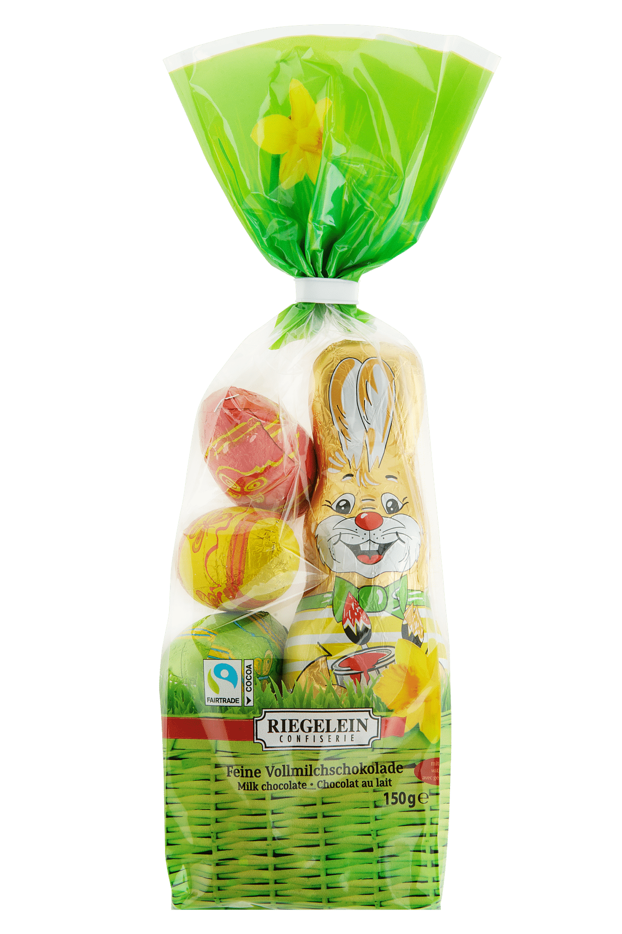 En väldekorerad och snygg påse med olika påskmotiv på, innehållande massa olika påskfigurer så som ägg m.m samt en stor och god kanin, allt i ren härlig mjölkchoklad.
