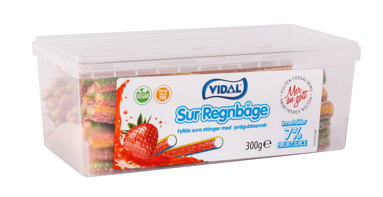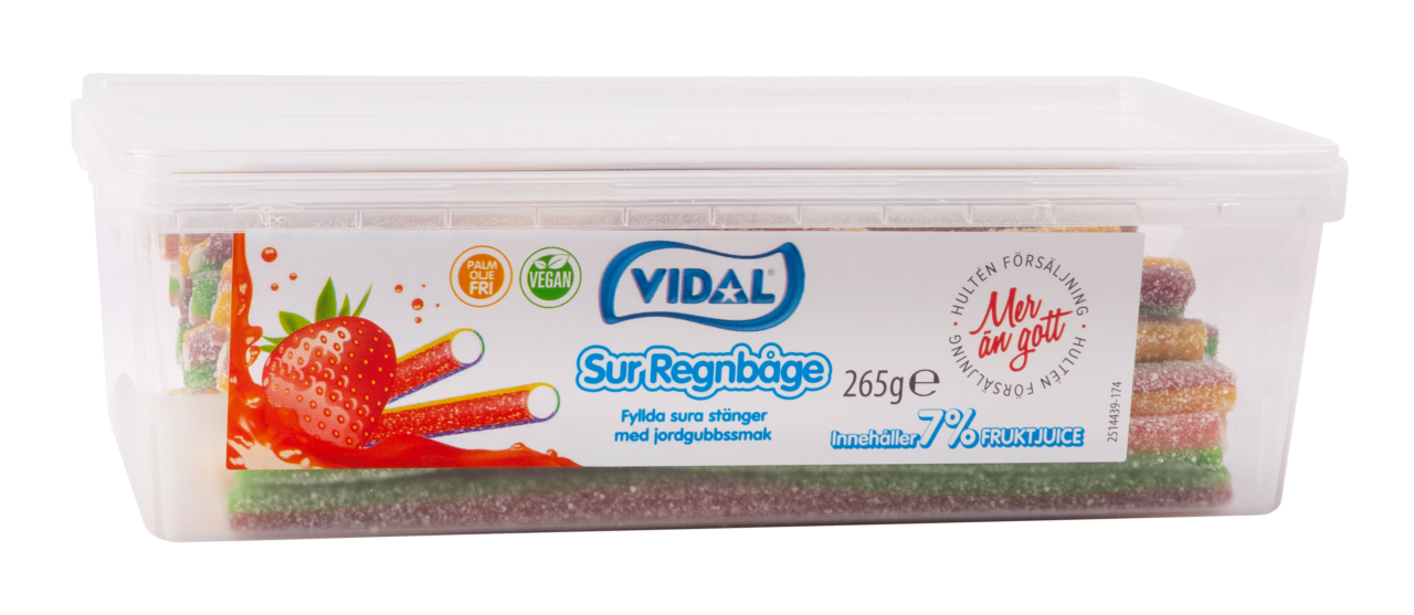 Härligt sura stänger som verkligen ser ut som en regnbåge. Gelatinfria stänger som är lätta att ta ut och äta tackvare den fiffiga asken med lock. Många härliga färger och spännade smaker.